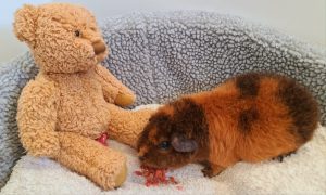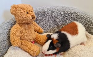 Rachel is a very friendly piggy who originally came from a hoarding case in September 2024. Rachel was very poorly when she arrived and had an ovarian cyst removed. She still has a cyst on her kidney which can’t be removed. However, even with health issues Rachel loves her food and enjoys living side by side next to her friend Peanut.