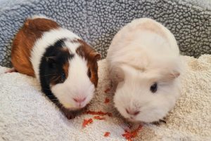 Jezza (dark brown) & Gloria (white with grey) came into the shelter together in January 2024 at the age of 18 months old. Gloria has got interstitial cystitis which causes her a lot of pain when she has it. The pair are very are both large guinea pigs so their diet consists of hay and fresh food only, so no pellets for this pair.